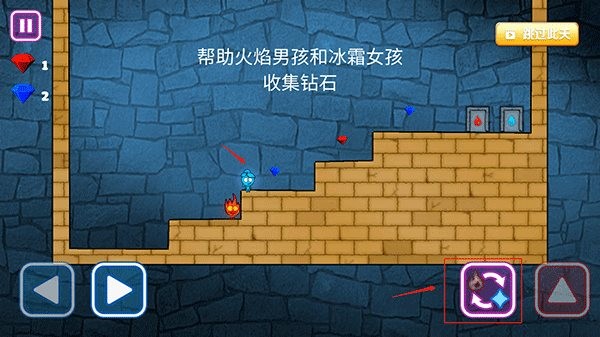 吃掉红宝石后,点击切换按钮就能把操控角色换成冰,接着操控冰去第二格吃掉蓝宝石。