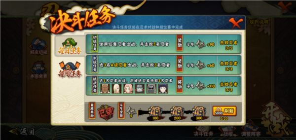 完成升级密卷和达成忍者招募的指定数目,就能领取相应数量的金币(金币数额会递增,最高可达500金币)