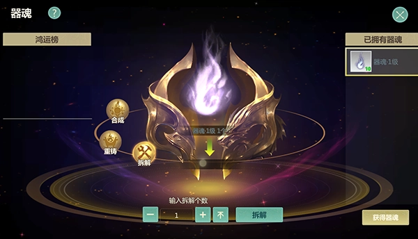 高等级的器魂能够分解成低一级的两个器魂,而1级器魂不允许进行拆解操作。