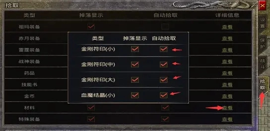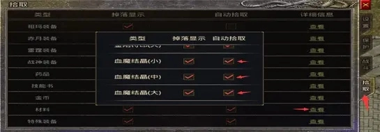血魔精华和金刚之精的获取方式并非只有试炼任务这一种,平时挂机刷小怪或者挑战BOSS时也有几率掉落,只要在拾取设置里开启自动拾取功能就能轻松获取了。