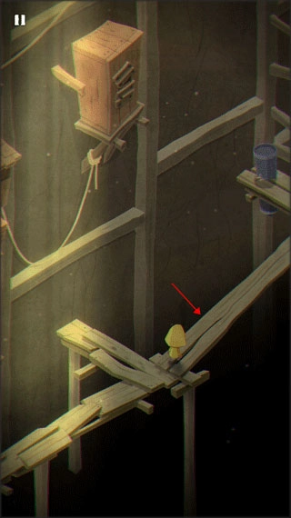摩诺避开木桶,顺着楼梯向上攀爬,只要使劲挪开这两块木板,就能进入下一个关卡了。