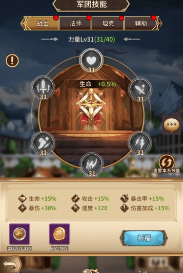 军团技能包含战士、法师、坦克、辅助这4个阵容技能,玩家升级时需消耗相应的军团贡献与金币,提升这些技能能够让战斗力得到快速增长。