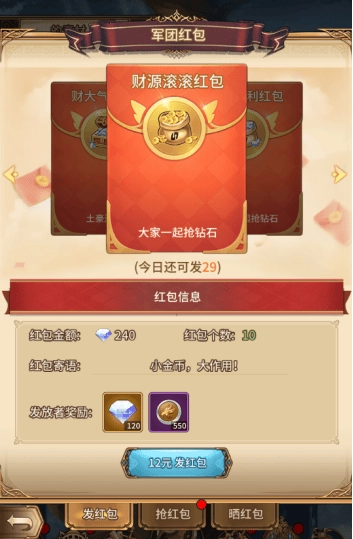 加入军团后就能领取红包啦,军团红包主要包含发红包、抢红包和晒红包这三个板块。发红包的话,玩家得先购买红包才能发放,目前有12元、50元、648元这几个档位的红包可供选择,购买的红包价格越高,发放者能拿到的奖励就越丰厚,不过每个档位的红包购买和发放次数都是有限制的哦。