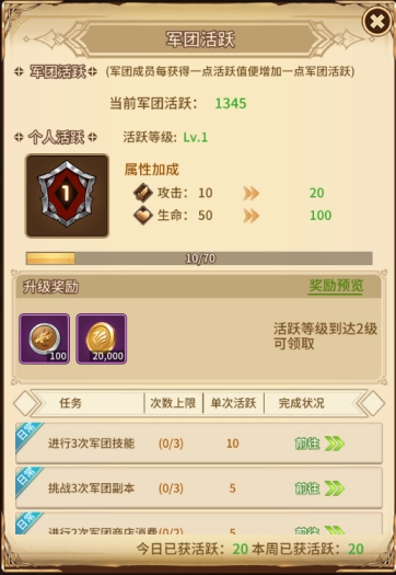 玩家在军团捐献处完成捐献后,可前往军团活跃处进行升级,同时领取相应的军团贡献与金币。升级奖励的领取需依据活跃等级,等级越高,所能获得的奖励也就越丰厚。