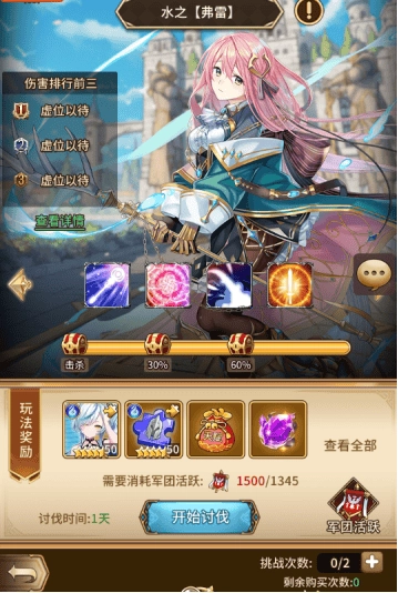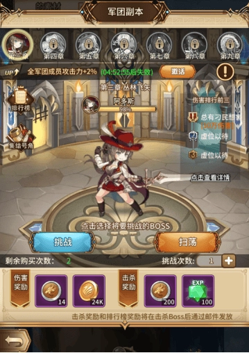 军团副本总共包含100个章节,每个章节都得先把对应的BOSS击败才能解锁下一章。这个BOSS是世界BOSS,需要军团里所有成员一起努力才能将其消灭。每天有2次挑战机会,用完之后还能花20钻石购买挑战次数,最多可以买4次。BOSS头顶有个激活按钮,军团成员消耗20钻石就能激活该功能,激活后能让全体成员的攻击力提升2%。奖励分为伤害奖励和击杀奖励两个部分。