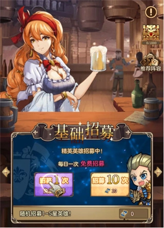 玩家创建角色成功进入游戏后,需按照系统指引完成新手任务。在此过程中,玩家可前往酒馆的高级招募界面进行一次招募,这次招募必定会获得一名5星英雄。建议前期优先培养该英雄,待其养成后,前期的关卡基本都能顺利通过。