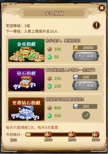 军团捐献包含金币捐献、钻石捐献和至尊钻石捐献三个部分,玩家每日最多可进行一次捐献,次数会在每天0点重置。捐献档位越高,军团等级提升速度越快,成员能获得的奖励也会更丰厚。