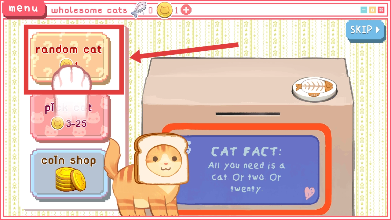 在菜单界面中,点击随机猫咪按钮,花费金币即可获得随机猫咪,以此扩充猫咪队伍,加快收集进度。