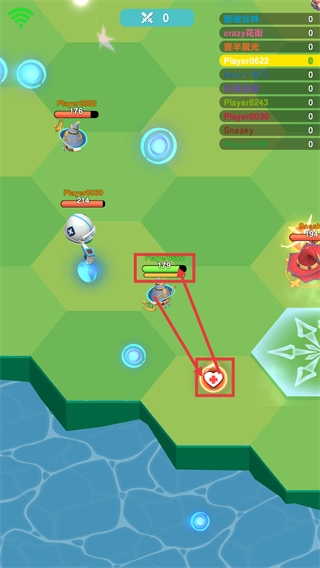 3、攻击敌方单位(如【Player0030】)可降低其血量,同时自身血量会提升,借此巩固对战优势。