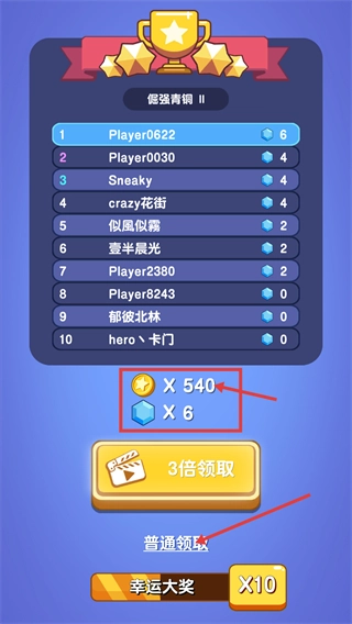 4、排位获胜后段位升至【倔强青铜-II】,可领取【540-金币】与【6-钻石】奖励,选择【普通领取】快速获取资源。