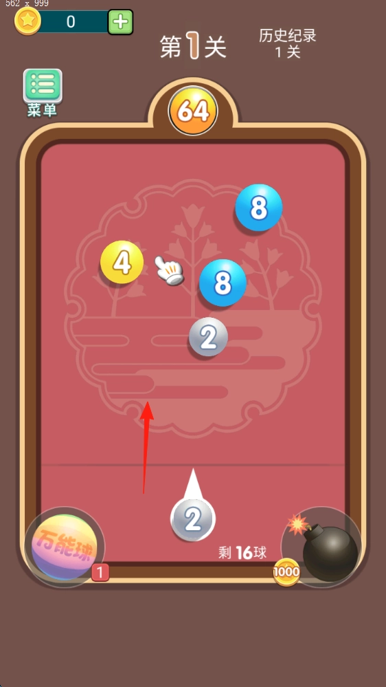 合成16球后(红箭头标记处),请集中所有火力,瞄准相同数字的球(即16与16合并),以此清空整个棋盘,朝着关卡目标64发起冲击,从而解锁新的关卡。