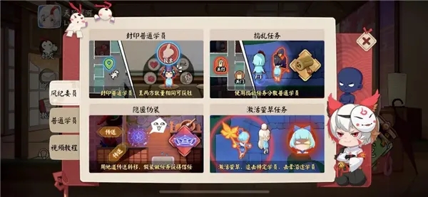 普通学员要通过完成各类任务来收集情报,每个人的任务都有细微差别,有些任务还得多名学员一起协作完成,任务类型涵盖修复路牌、大胃王挑战、弓道比试、泡温泉、打包盒饭等。