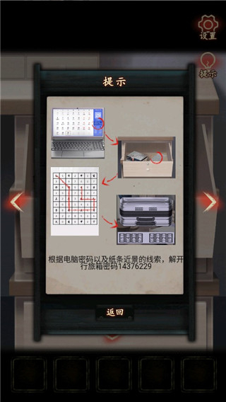 点击梳妆台下方的抽屉,用【钥匙】开启第一个抽屉,查看右侧的线索,仅依据生辰八字进行连线,连线经过的数字即为密码箱的密码14376229。