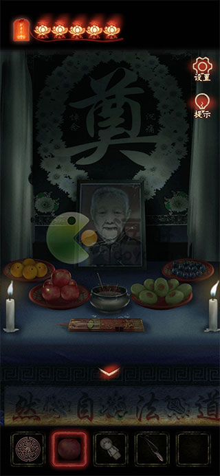 狮子机关的提示:眼睛对应的操作是拔下门口羊角锤旁最左边布上的钉子,铃铛对应的位置是右边的花圈。