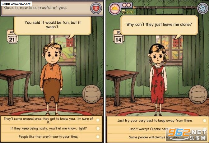 游戏构建了一个模拟情境,能让你真切体会那些曾在充满敌意与恐惧的环境中成长的孩子们的内心世界。现实社会中存在的校园霸凌、欺辱等问题,需要玩家以养父母的身份去为孩子进行解释、疏导,抚慰他们受伤的心灵。在游戏过程中,玩家需要仔细观察孩子们的神态与言行,协助他们处理遇到的各种困扰。面对孩子的问题,不同的解释角度与教育方法会产生不同的引导效果,而玩家给出的每一个行动选择和建议,也都将触发不一样的故事走向。