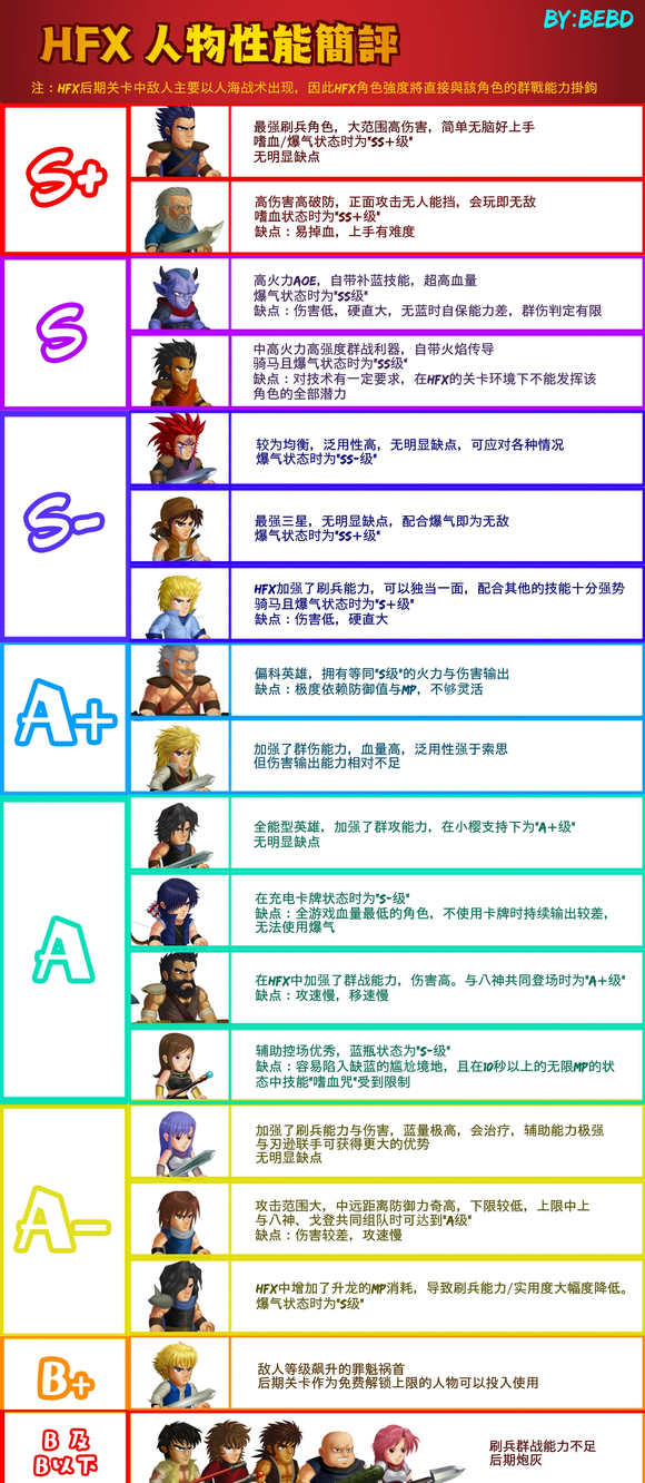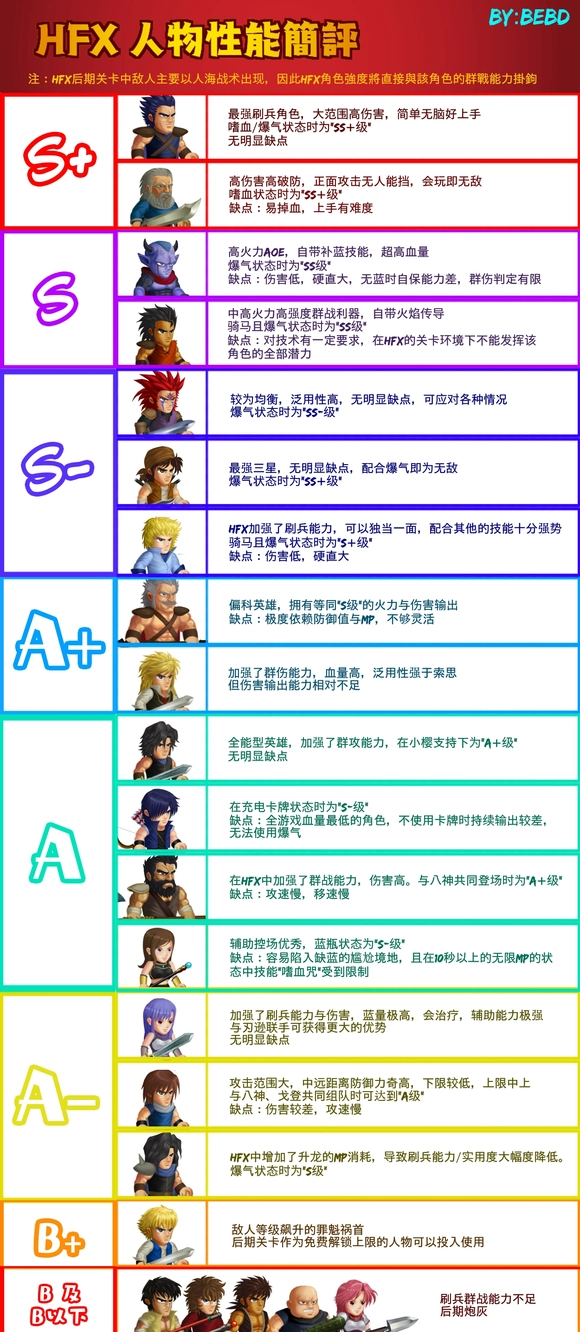 和HF(无等级化)相比,HFX里飞龙斩的消耗从18%下调到了12%,昇龍斩的消耗则从50%上调至60%。这样的调整使得对抗英雄团时的爆发力和强度有所降低,不过针对中小型兵团的刷兵能力得到了增强。