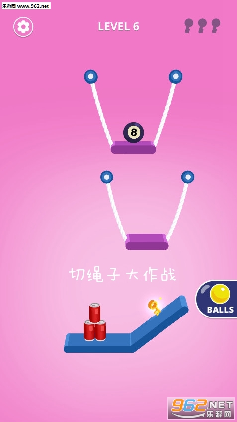 《切绳子大作战》是一款十分经典的割绳子玩法休闲闯关游戏,其玩法十分简单,你需要思考怎样割断绳子,才能让绳子上的铁球击倒所有易拉罐,或是获取钥匙,如此方能顺利闯关。