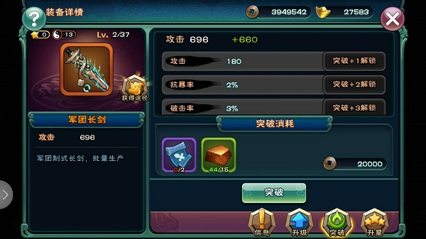 每次突破都能显著提升装备的基础属性,并且会额外新增1条属性,突破等级最高可达到+5。