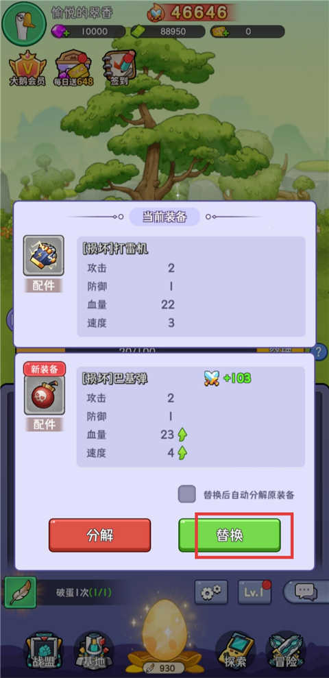 3、刷出了高阶装备,点击【替换】将高阶装备穿戴上。