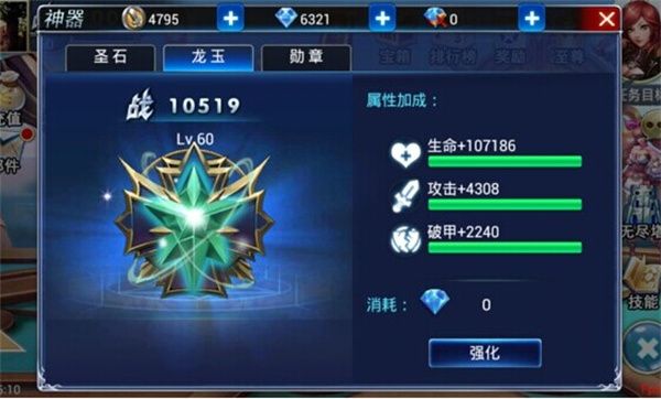 圣石系统:等级上限为60级,累计可提升战斗力2098点,强化过程消耗金币。尽管游戏前期阶段金币资源相对紧张,但进入中后期后,金币的获取渠道会变得十分丰富,储备量也会相当充足。在前期,建议玩家通过挑战金币副本来积累金币用于圣石强化,这对于想要冲击排行榜的玩家而言是必做任务,将第一个圣石(神器)提升至满级难度不大。