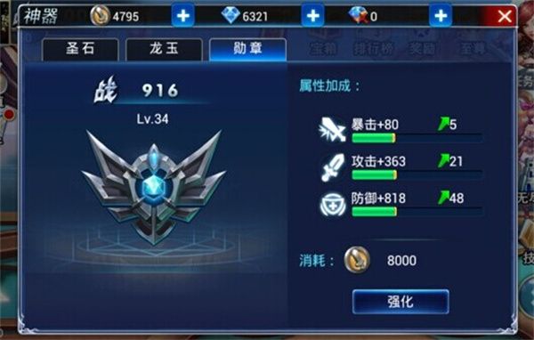 勋章:它通过竞技点来强化,而竞技点需从竞技场获取,对提升竞技场排名来说,这一强化环节十分关键。竞技场的挑战次数每10分钟会恢复1次,在游戏前期,挑战成功一次通常能拿到几十点竞技点。随着角色战力的提升和等级的增长,后续每次挑战成功获得的竞技点也会相应增加。