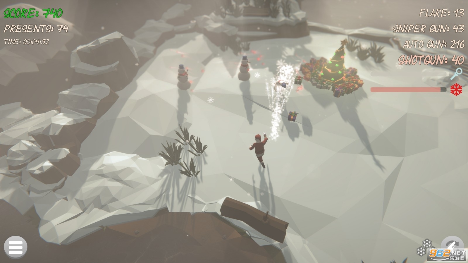 手枪:圣诞老人始终配备着这把雪球射击手枪,即便你没有任何强化道具或特殊武器。它射速较慢,射程较近,造成的伤害也不大,但它永远都在,并且弹药无限。