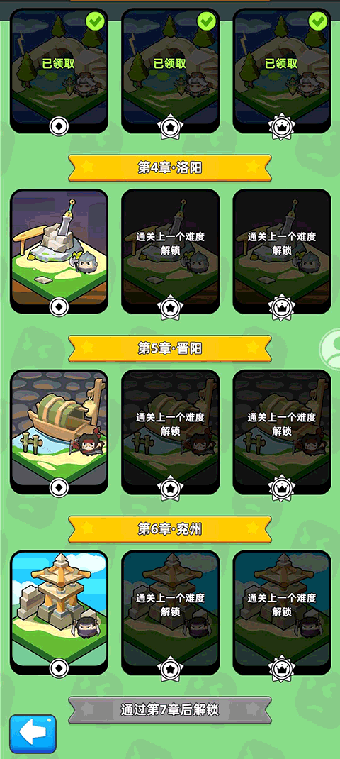 每完成一个主线章节,即可解锁副本对应的章节,每个副本章节都包含三个关卡。