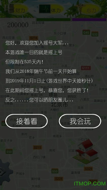 模拟一个在北京工作生活的普通人。游戏的核心目标是让玩家在限定日期前成功摇到车牌,若到期未摇中则游戏失败。非摇号阶段,玩家可体验日常起居;同时,还能执行找工作、就医、购车及参与摇号等操作。游戏启动后,地图上会持续刷新各类道具,这些道具分为陷阱类和增益类(可提升体力、心力),点击即可获取对应效果。每天系统会自动扣除一定的体力、心力与金钱,不同职业对应的心力体力消耗速率及收入水平各不相同。摇号环节中,玩家可主动触发强制摇号,操作后会即时显示摇号结果。游戏整体节奏偏快,需要玩家及时对自身的生活事务进行规划与操作。