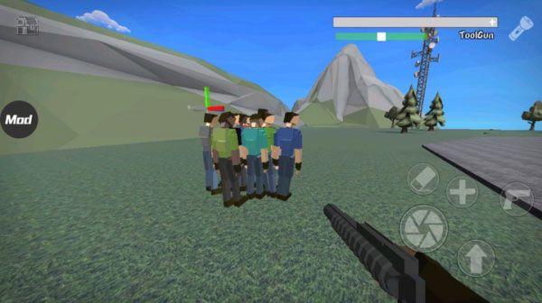 操作方式十分简单:左侧控制移动,右侧负责射击;点击左上角可切换武器。用当前持有的武器点击物体,会出现蓝色引线,将这些引线连接好后,就能通过滑动屏幕来调整物品的位置了。