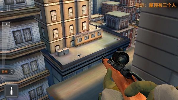 在游戏里,我们遵循狙击手的操作准则:保持原地静止以等待目标出现,期间不能移动位置。瞄准狙击枪的方向需要通过滑动屏幕来调整,狙击镜的放大倍数则由拖动屏幕左侧的缩放按钮控制,拖到最顶端时倍数达到最大。射击操作是点击左下角的子弹图标,当我们用放大的狙击镜射击后,右上角会弹出装弹按钮,点击即可补充子弹,当前剩余的子弹数量可以在屏幕左下角查看。