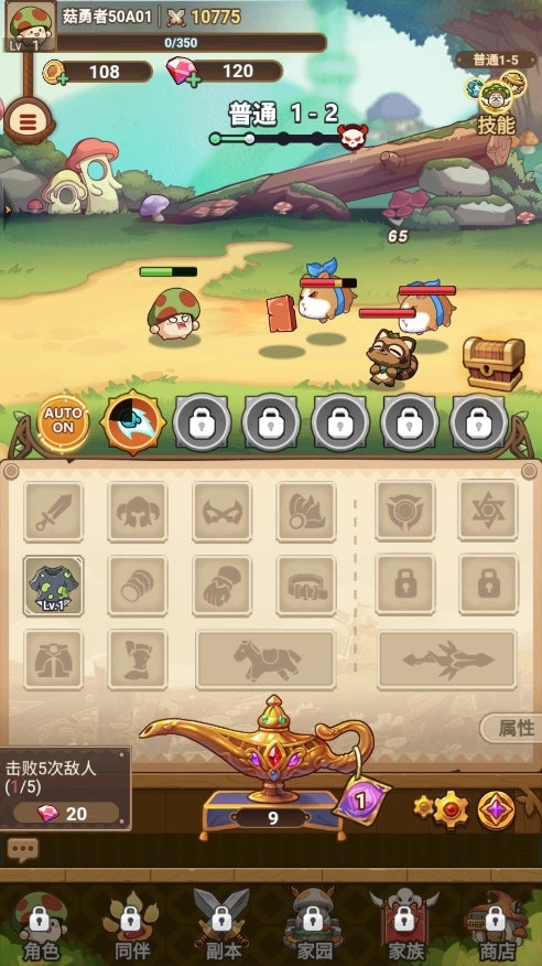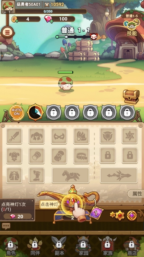 7、点击下方的【角色】选项,再点击技能按钮,就能对蘑菇进行一键装配或一键强化操作。