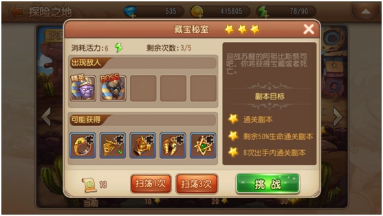 秘境宝藏包含两种玩法:每周一、三、五开启的侠盗试炼,参与可获取大量金币;每周二、四、六开启的防守恶魔,参与可获取大量经验。玩家每日拥有两次挑战机会。