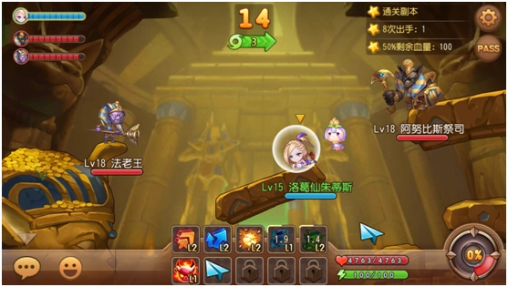 分析这张地图,通关难度不大。左边精英怪的血量比右边boss少,优先攻击精英怪能降低所受伤害。只要合理分配有效攻击,8次出手结束战斗并非难事。不过要注意,两个怪物攻击力都很高,在2V1的局面下,8个回合内让它们血量过半难度不小。