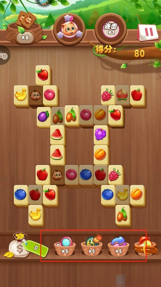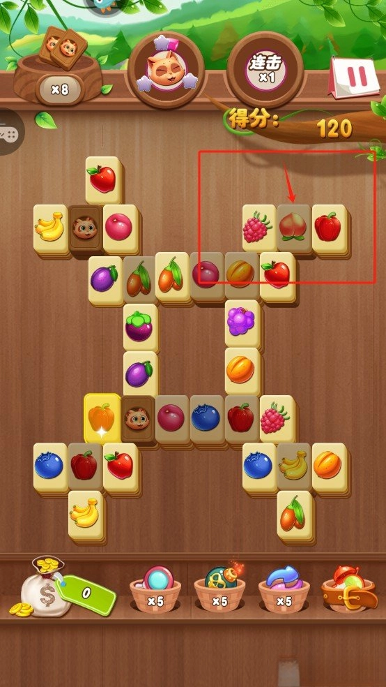 3.夹在中间的水果无法直接消除,得先把它旁边的水果消除掉才行。
