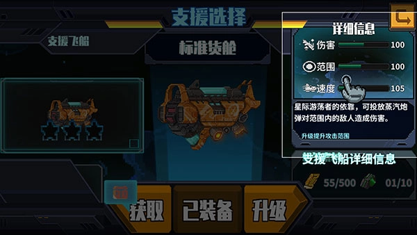 在支援库里能够查看所有飞船的相关信息,我们也可以在这里获取飞船以及进行升级操作。