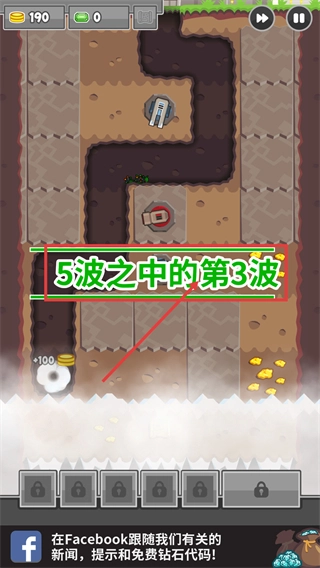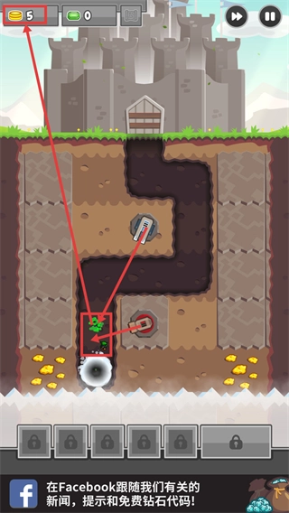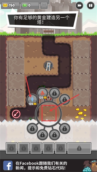 留意左上角的金币数目,在地下通道里收集金币时,要抵挡绿色敌人的攻击,积攒资源以便为之后建造塔楼做好准备。