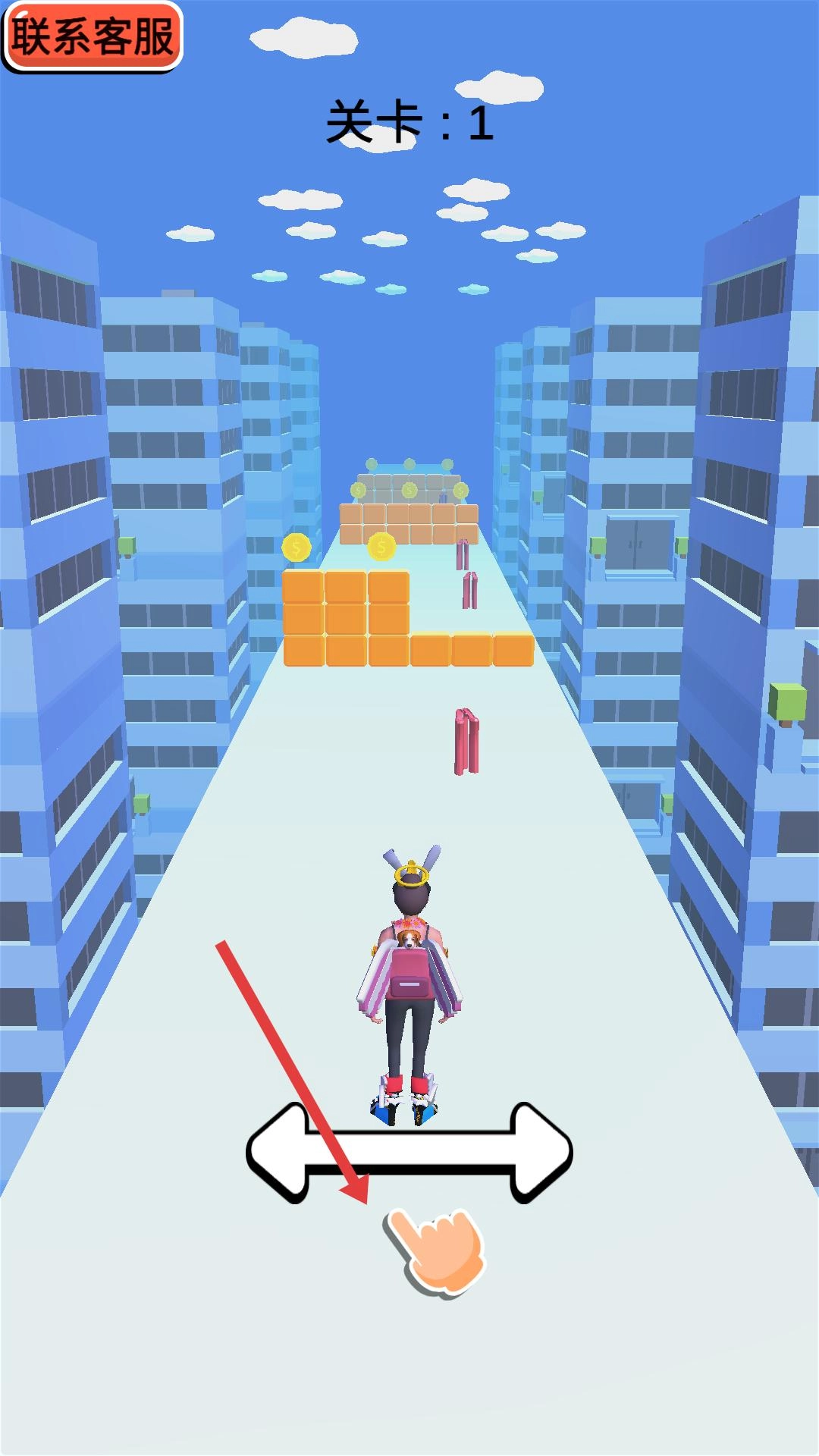 基础跑酷的操控方式如下:通过左右滑动屏幕来调整角色的横向站位,角色会保持自动前进的状态,你需要精准地引导角色穿过狭窄的通道,同时避开途中遇到的各种障碍物。