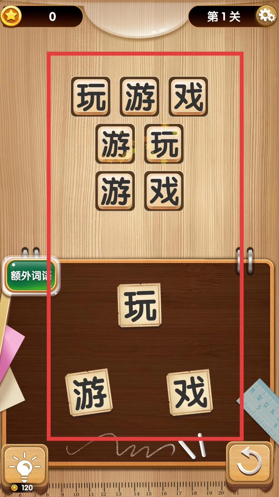 进入游戏第1关的界面后,能看到界面的上方与下方都分布着汉字方块。按照游戏规则,你需要按顺序把这些汉字方块连接起来,试着组成词语,完成词语的连接操作。