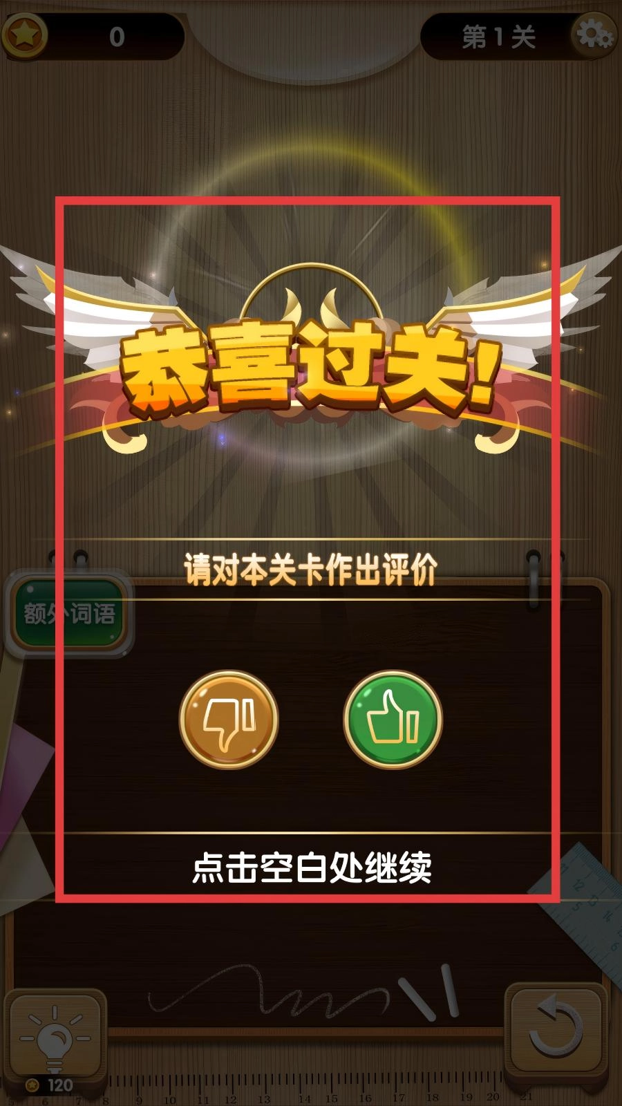 当成功拼出足够数量的词语后,游戏界面会弹出恭喜过关的提示,同时提供对本关卡的评价选项,点击空白区域就能继续挑战下一关。