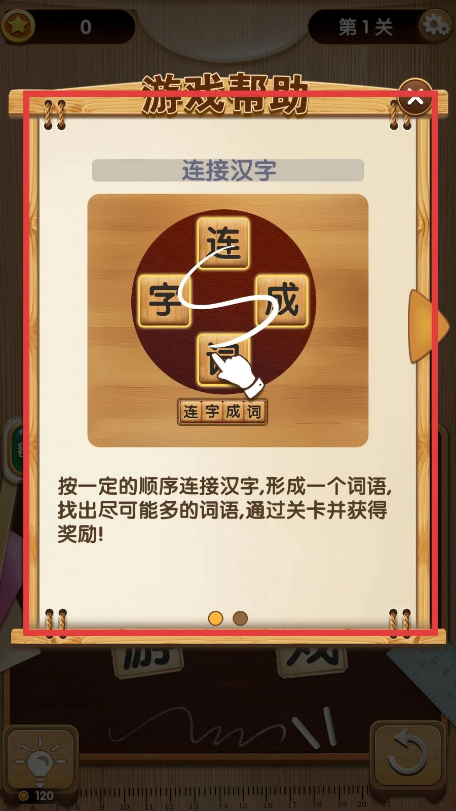 进入游戏帮助界面后,这里会呈现连接汉字的游戏规则:需按照特定顺序将汉字连接起来组成词语,玩家要尽可能找出更多词语,以此通过关卡并赢取奖励。之后关闭帮助界面,就能进入第1关的游戏界面了。