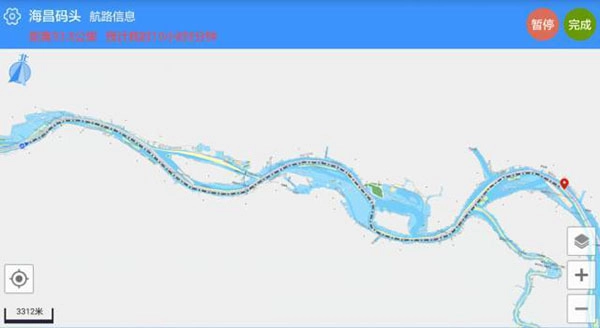 点击查询结果后,系统会直接定位海昌码头在地图上的实际位置,并展示出海昌码头与您船舶之间的距离以及预计航行时间。若再次点击“去这里”,系统将规划出从您船舶当前位置到海昌码头的航线。