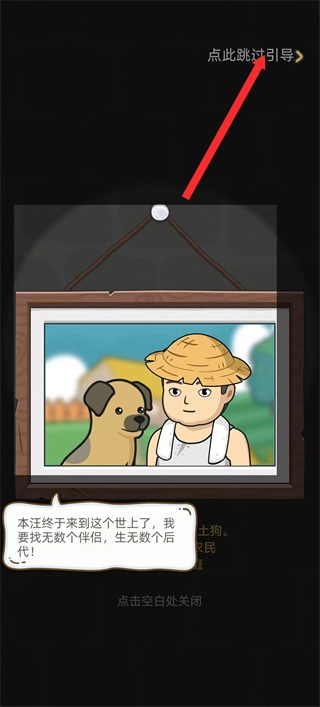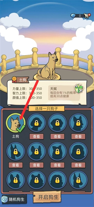 进入游戏后,点击红色箭头所指的土狗选项,选定初始狗狗角色,这是开启游戏养成玩法的关键步骤。