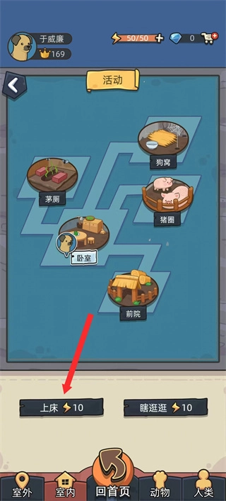 3、进入室内活动页面后,找到红色箭头所指的上床按钮并点击,消耗相应资源即可让狗狗进行休息互动,以此积累养成进度。