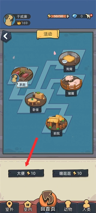 4、之后点击红色箭头所指的大便按钮,完成与狗狗的日常互动步骤,以此不断推动角色的养成进程。