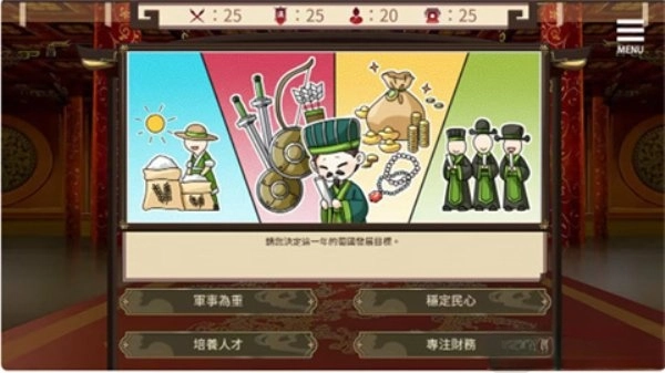 以民为重:军事-3、忠诚-3、民生+5、经济+5