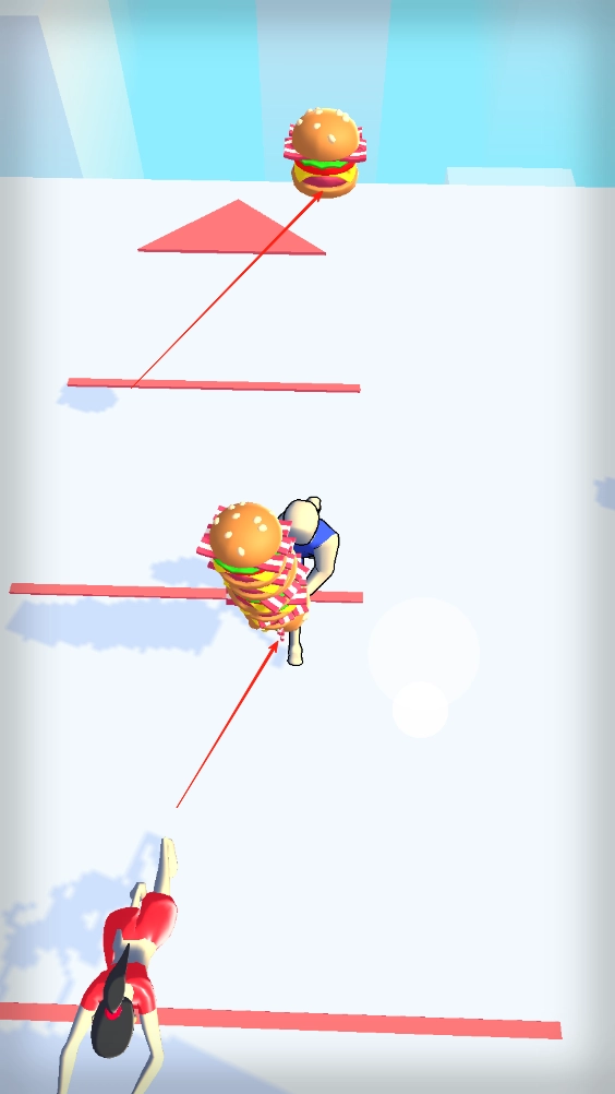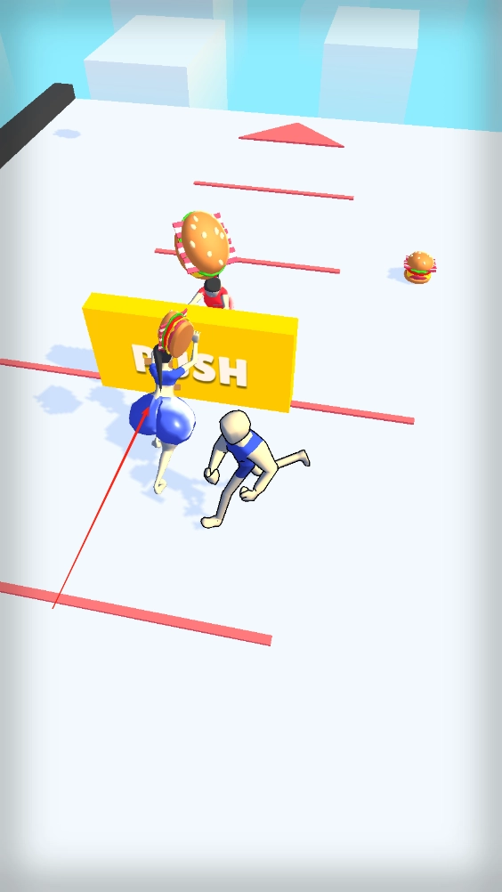 玩家操控角色去收集散落在各处的汉堡,两位小姐姐在场地中央推挤着板子,地面上设有分界线,需要用收集到的汉堡来帮助小姐姐们提升体能、增强体魄。
