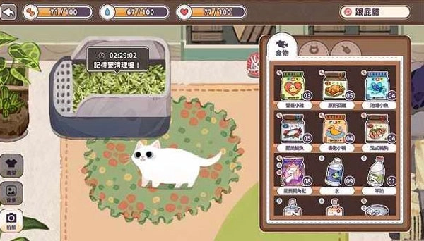 等会儿猫咪来了还能给它们起名字,之后从左下角点击“饲养”按钮进入,页面最上方就能看到猫咪的状态,查看你的猫是否饥饿、口渴以及心情怎样。根据猫咪的具体情况,你可以把食物、道具或者猫砂拖到猫的身上,但有时候喂食,猫咪主子可能不一定会吃,毕竟每只猫的口味都有所不同。