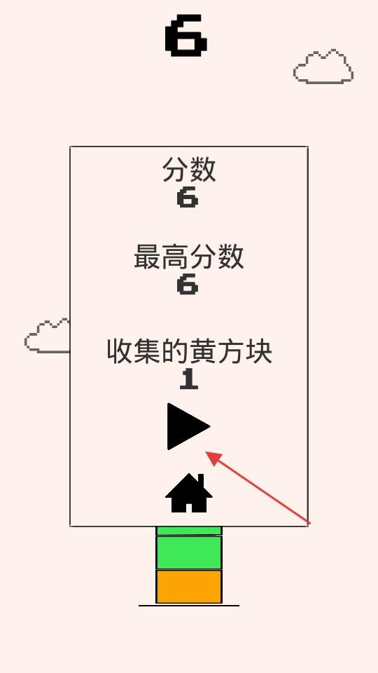游戏结束时会显示当前分数和最高分数,以及收集到的黄方块数量。点击黑色三角箭头即可重新挑战,点击房子图标则返回主界面。