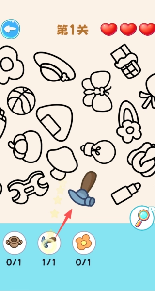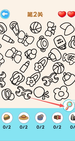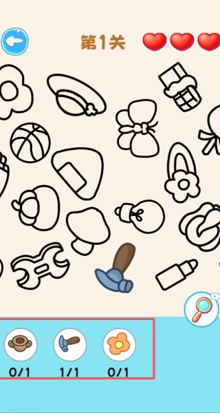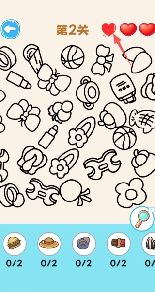 3、留意画面里重复出现的元素,把目标物品和干扰项区分开,图中有好几个蝴蝶结、篮球,要参照底部的目标栏,挑选出相匹配的物品,而不是那些重复的干扰元素,要是点错了会消耗红心。