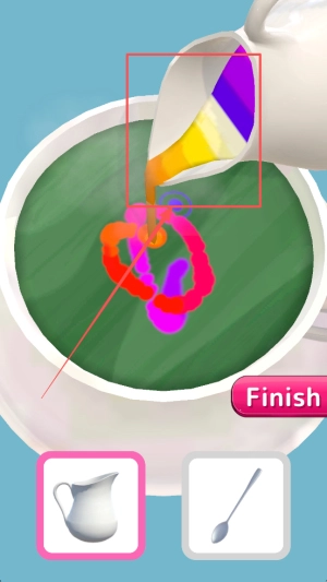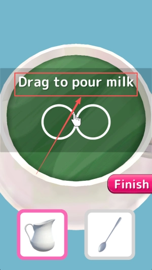 然后,不断调整倾倒角度,直至倒入的牛奶量到达“Finish”标线时,就可以停止倾倒了。